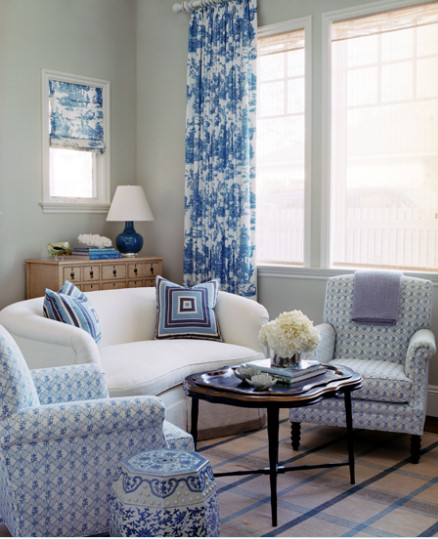Another pretty blue and white example from Waterleaf Interiors. Here, the stool's pattern is reminiscent of the toile on the curtains. This medium-sized, more ornate pattern is a great bridge between the larger pattern of the plaid rug and the very small scale trellis pattern on the chairs.